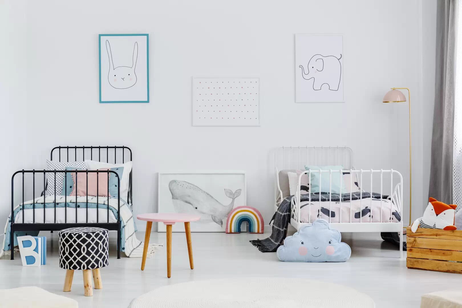 Детская для двоих детей из ЛДСП Egger. Включает кровать-трансформер с мягким изголовьем, кровать в нише, шкаф, открытые полки и рабочее место.