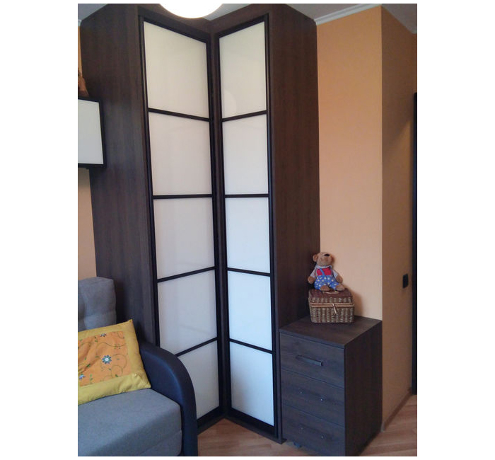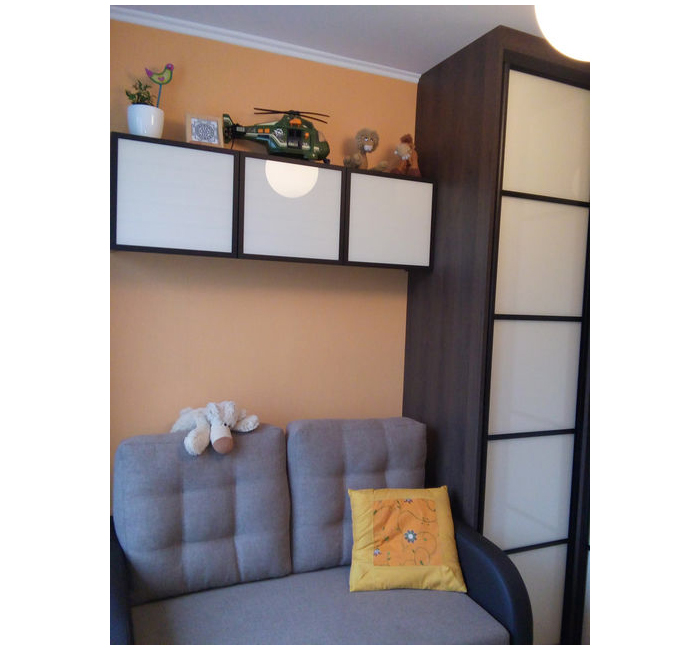 Компактный набор мебели для детской комнаты может быть использован в помещениях самых небольших размеров. Конструкция предназначается для расположения у окна и включает в себя шкаф и стеллаж, соединенные между собой столешницей. Столешница может быть использована в качестве ученического стола. На стеллаже можно удобно разместить школьные учебники и принадлежности. Шкаф сможет вместить большое количество детской одежды.