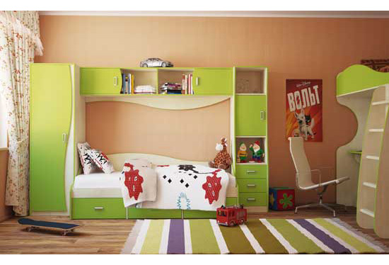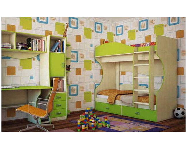 Набор мебели «Комби» – это свежее современное решение для организации детской комнаты. В комплект набора входит двухъярусная кровать, шкаф, письменный стол и множество полок. Цветовая гамма универсальна, подойдет как для мальчиков, так и для девочек. Цвет фасадов «лайм», по мнению психологов, создает идеальные условия для игр и направляет на успешную учебу. Набор является модульным, поэтому все элементы можно устанавливать в нужной вам компоновке.