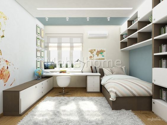 Включает две горизонтальные кровати-трансформеры с мягким изголовьем, рабочий стол и объемную зону для хранения