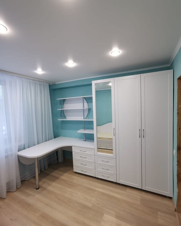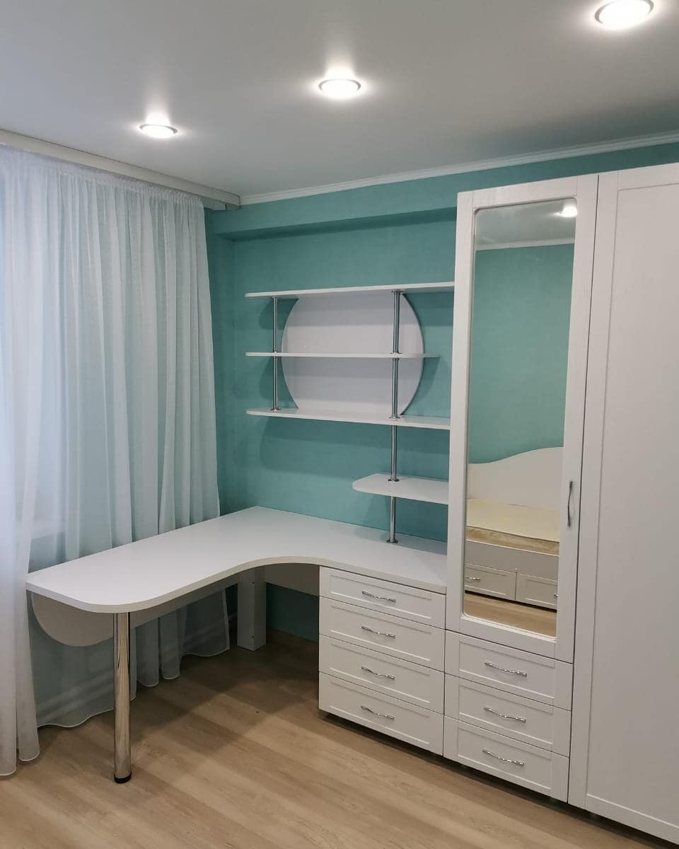 В набор входит: угловой стол с тумбой, 2 ств шкаф, пенал с зеркалом и ящиками, полки.
