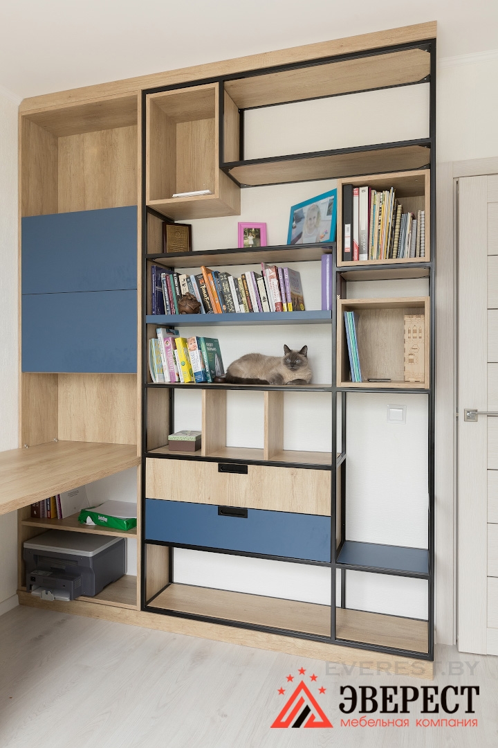 Широкий компьютерный стол с тумбой. Стенка-стеллаж с металлическими элементами.