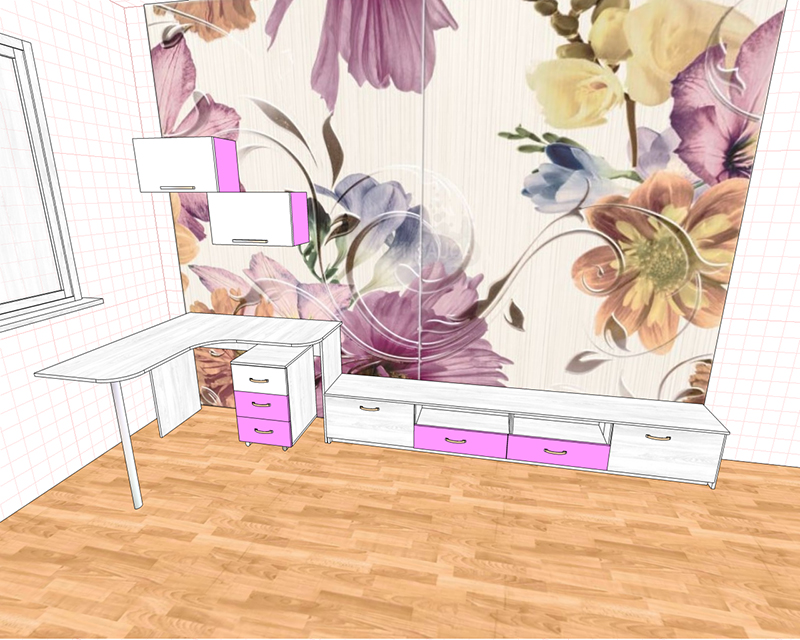Данный мебельный набор предназначается для комнаты девочки-подростка. Стол угловой конструкции позволяет рационально использовать пространство в углу помещения и располагать учебную зону вблизи источника дневного освещения. Стол имеет три выдвижных ящика, в которых можно удобно хранить школьные принадлежности. Прямоугольные настенные полки вмещают всю школьную и домашнюю литературу. Также присутствует невысокий комод с несколькими ящиками.