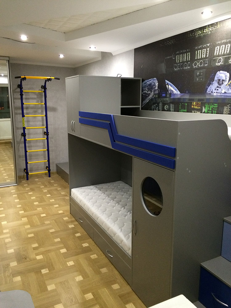 Компактная модульная конструкция позволит насытить максимальным функционалом самую небольшую детскую комнату. Набор рассчитан для установки в комнату для двух школьников. Кровать имеет два яруса, что позволяет значительно экономить площадь помещения. Доступ на второй ярус осуществляется по широким ступеням, в каждой из которых организован ящик для хранения вещей. В наборе также имеется высокий стеллаж и пара небольших шкафов для детской одежды.