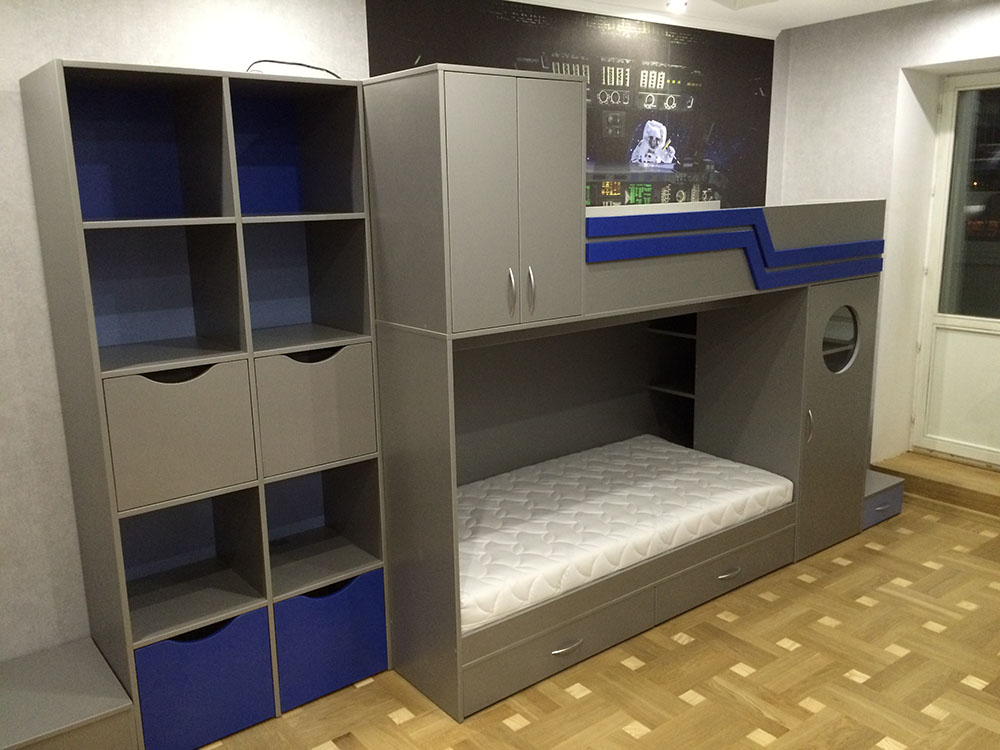 Набор мебели для двухместной детской в тонах беленого дерева и синем цвете.