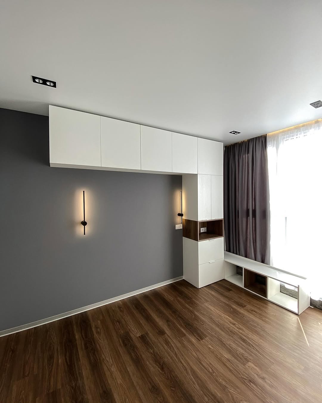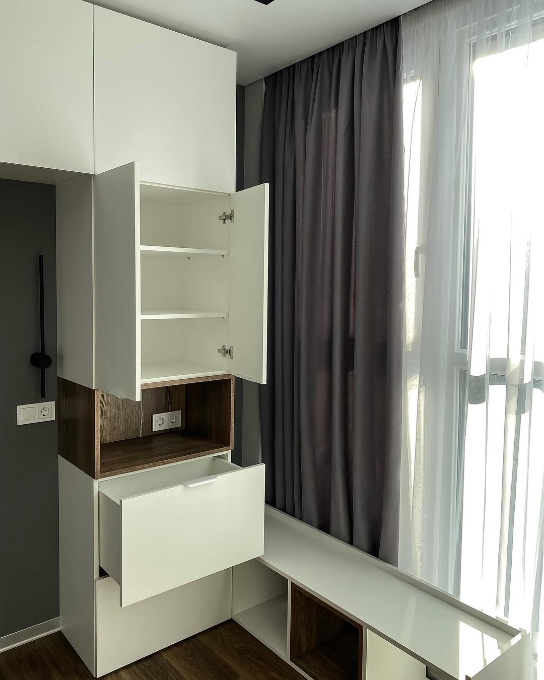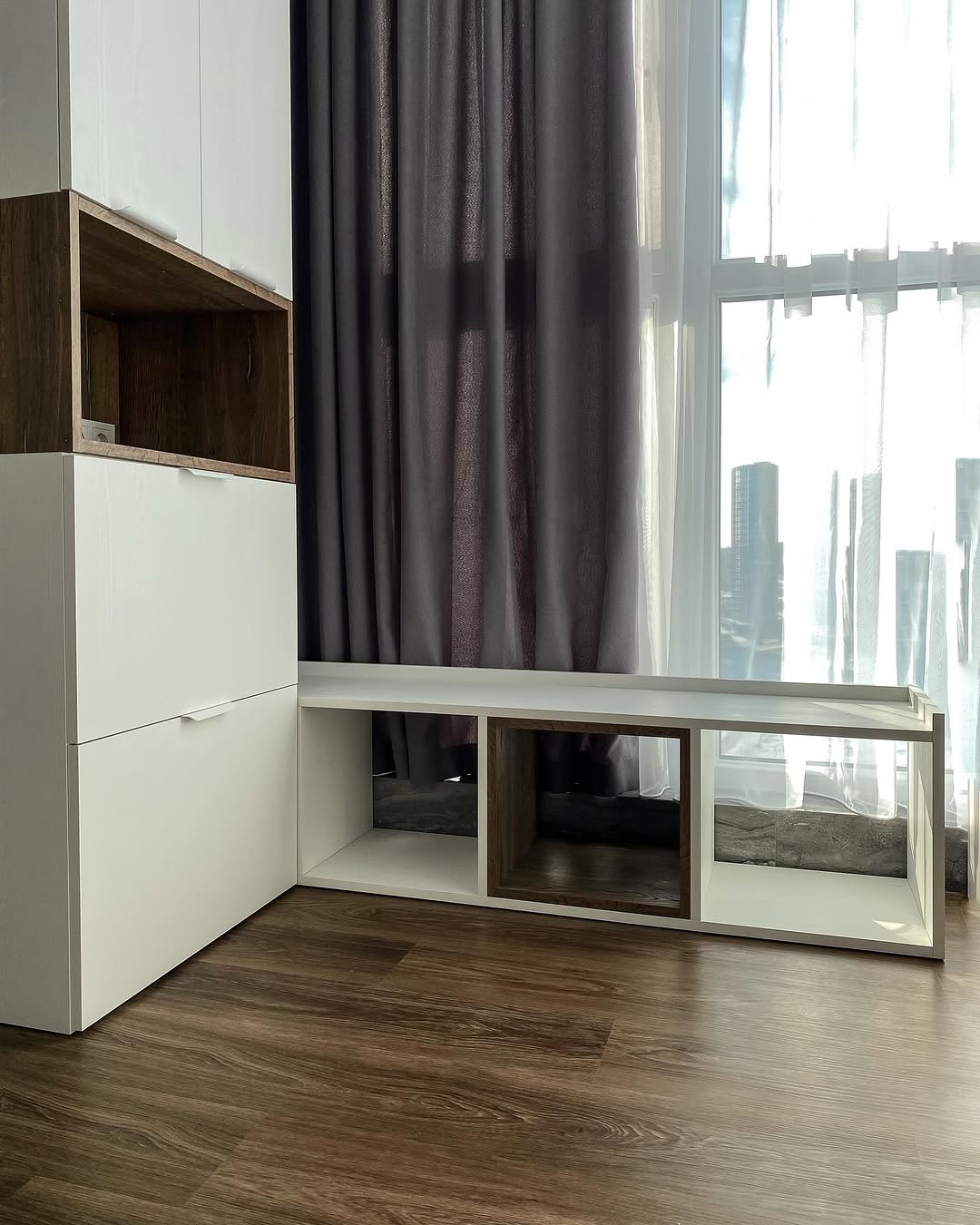 – Скамья у окна со встроенными ячейками для хранения и глянцевыми акцентами