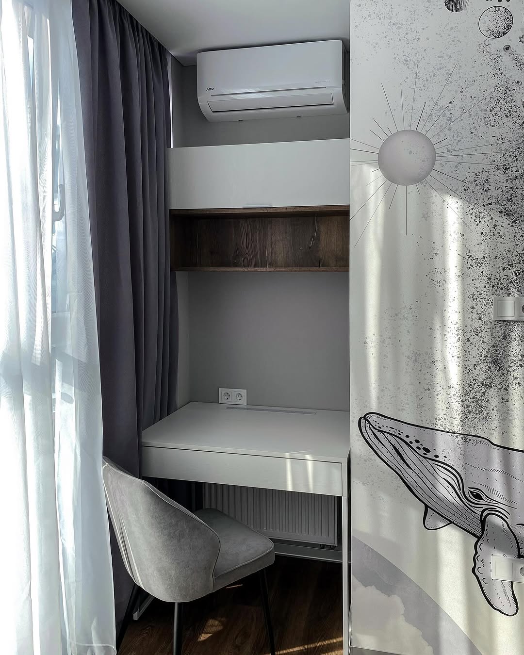 Современная и компактная мебель для детской комнаты. Комбинация белых фасадов и тёплого дерева создаёт уютную атмосферу, а продуманная система хранения не перегружает пространство.