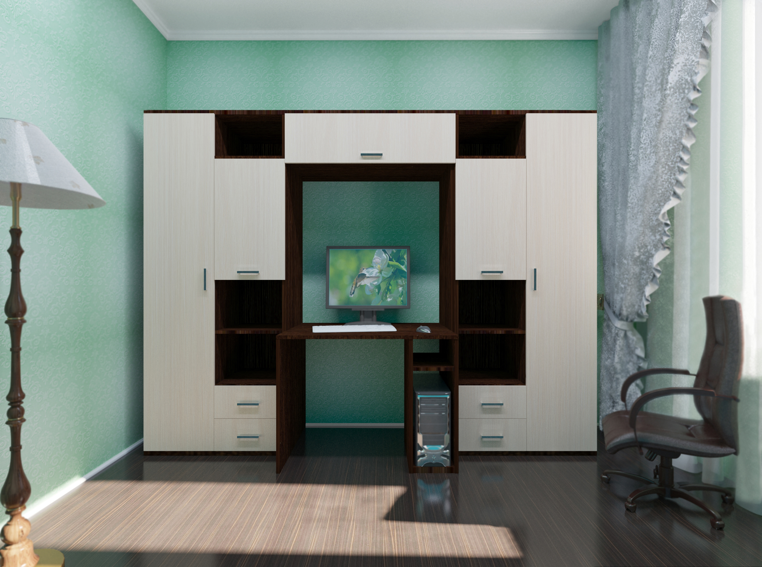 Два шкафа симметрично соединяются навесной антресолью, образуя арку над рабочей зоной. Очень удобно расположение открытых ниш и шуфляд в шкафах в непосредственной близости от стола.