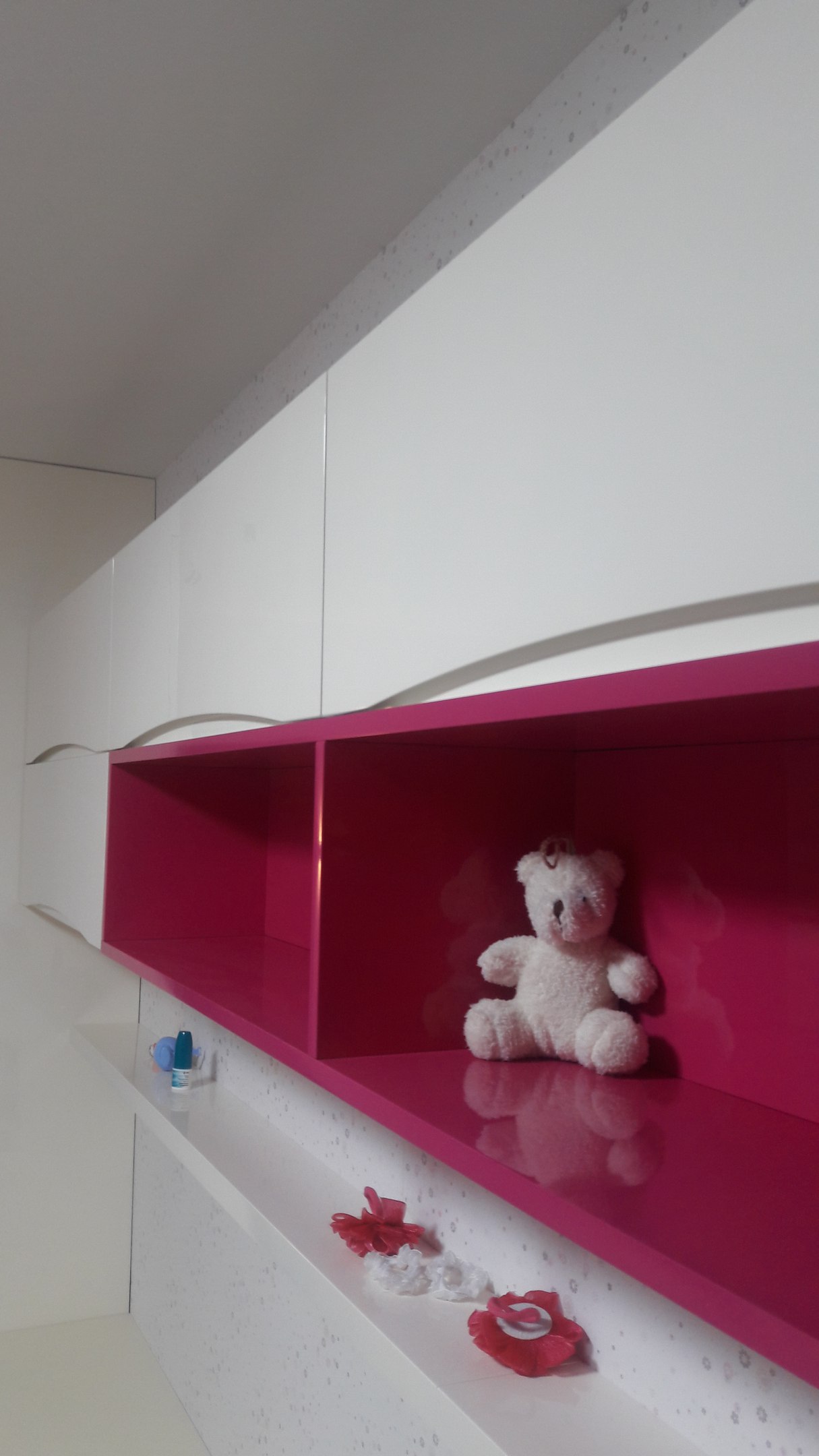 Белые глянцевые фасады, интегрированные ручки, вместительный распашной шкаф.