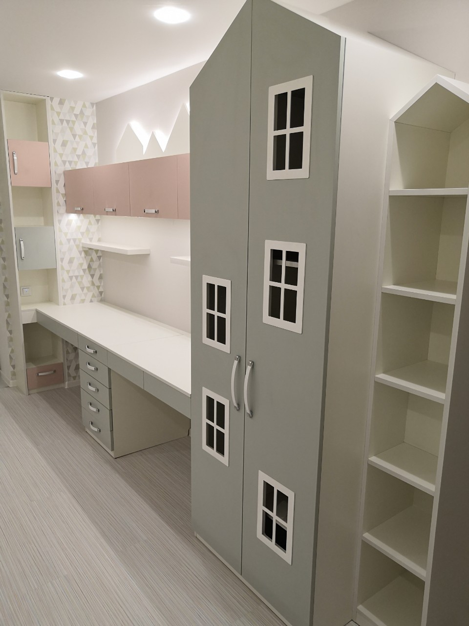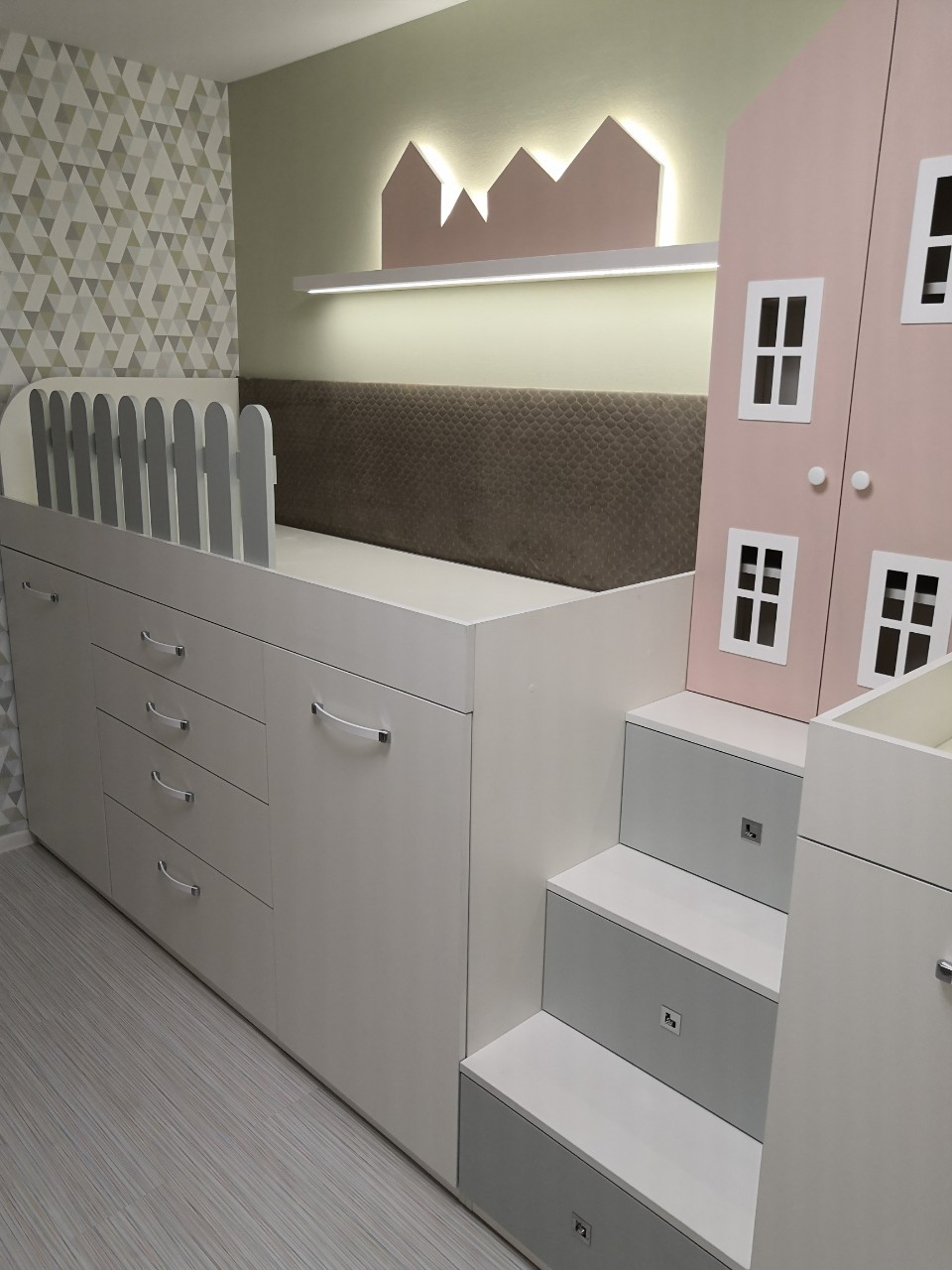 Детская для двоих детей из ЛДСП Egger. Включает кровать-трансформер с мягким изголовьем, кровать в нише, шкаф, открытые полки и рабочее место.