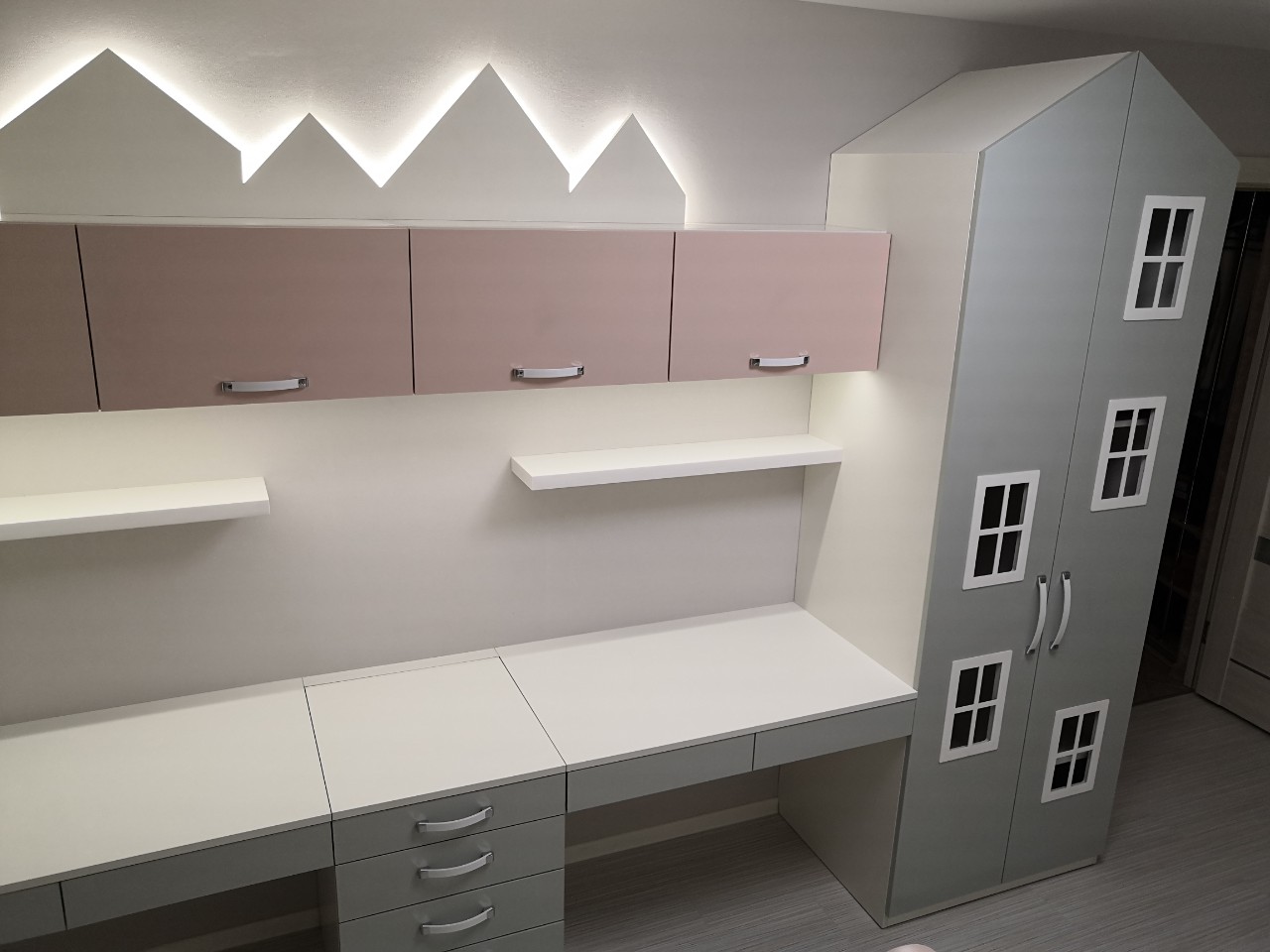 Детская для двоих детей из ЛДСП Egger. Включает кровать-трансформер с мягким изголовьем, кровать в нише, шкаф, оnкрытые полки и рабочее место.