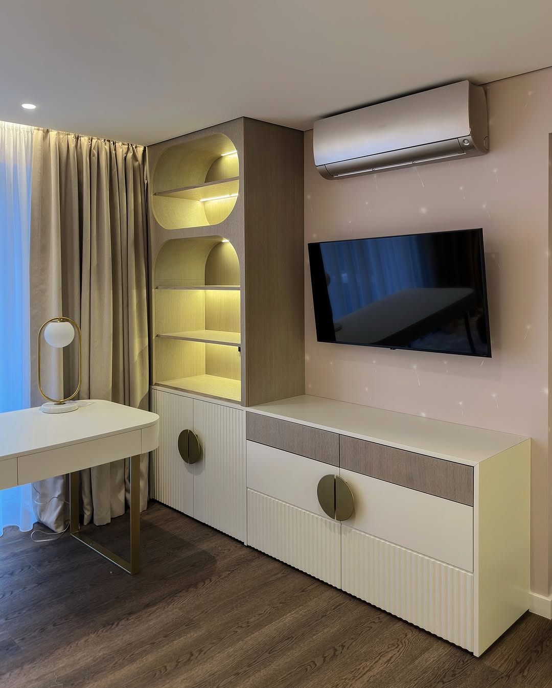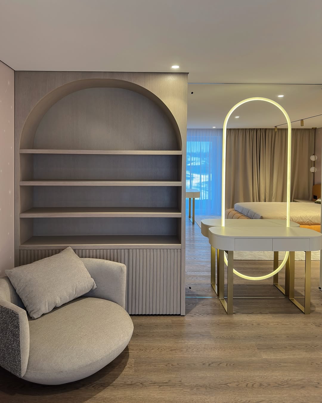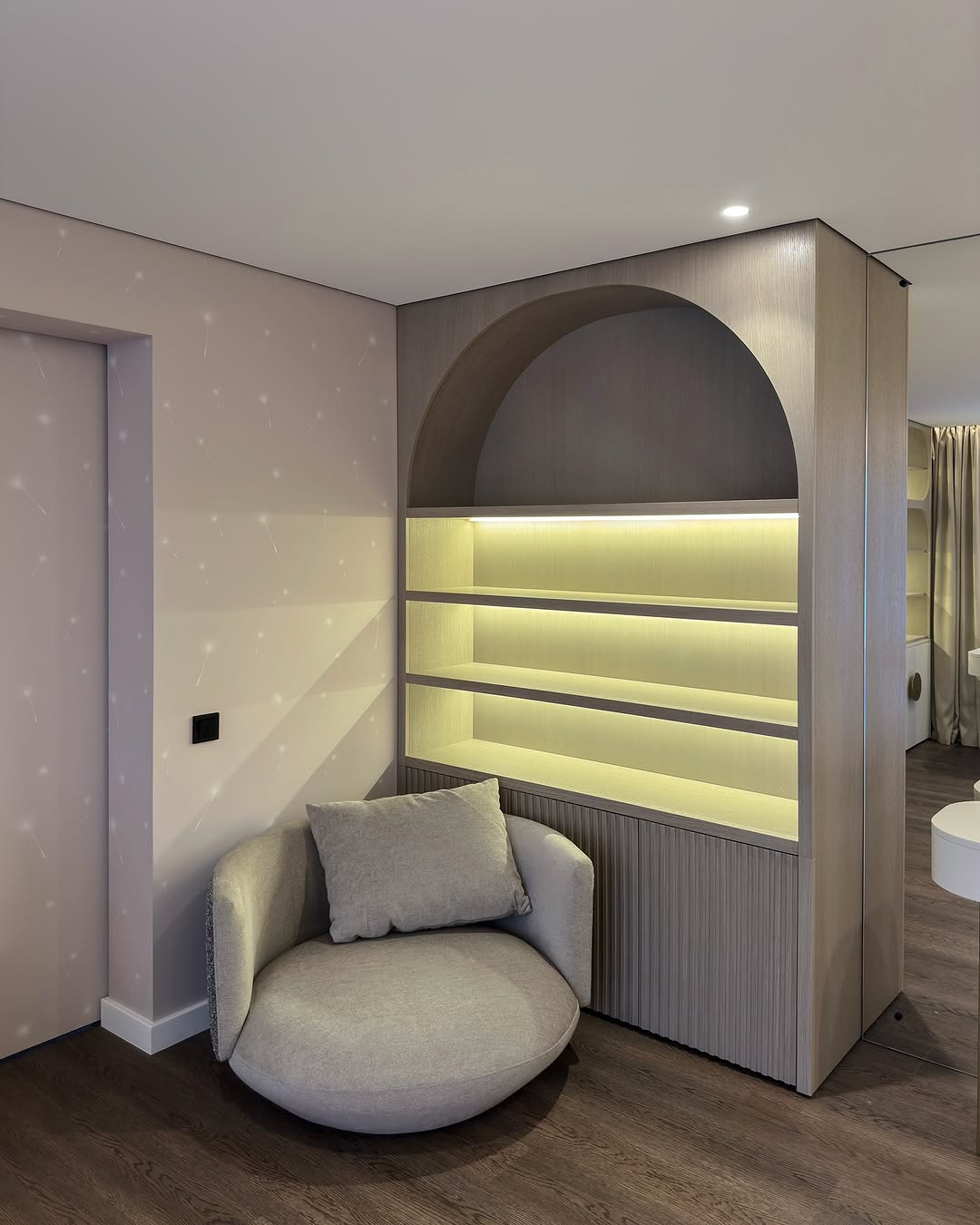 – Открытые полки с радиусными линиями и тёплой LED-подсветкой