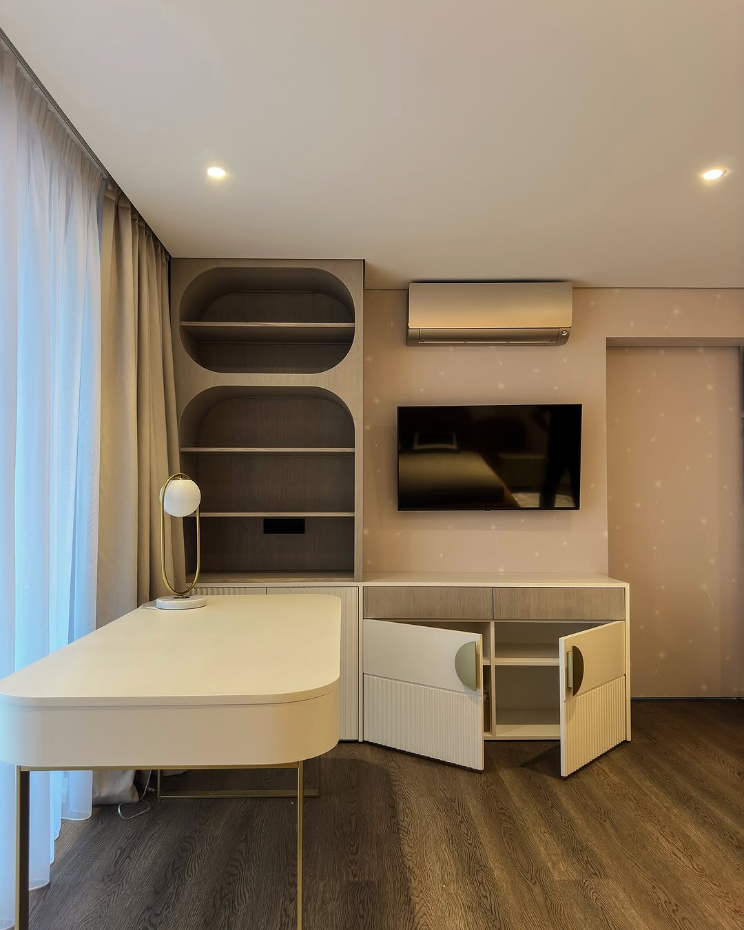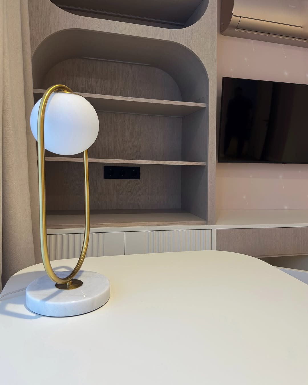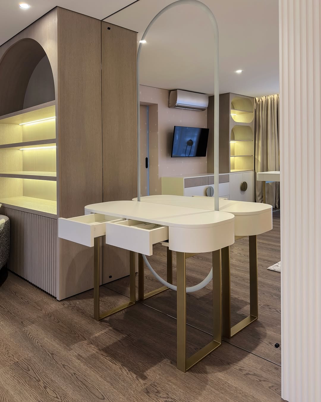 – Открытые полки с радиусными линиями и тёплой LED-подсветкой
