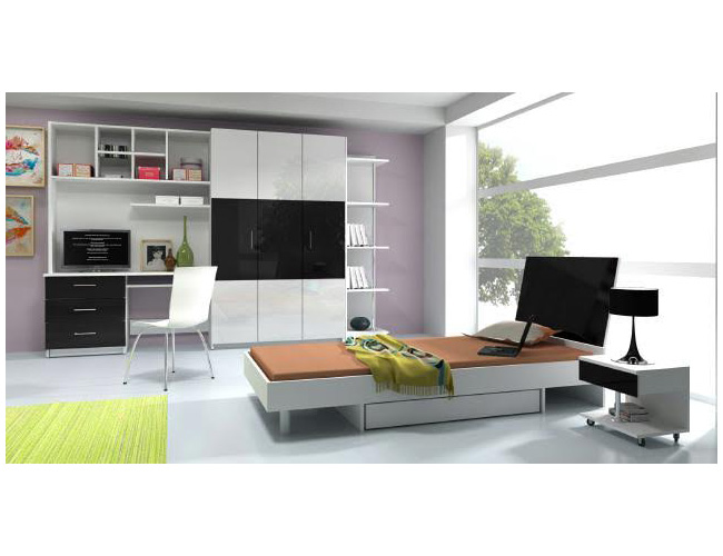 Представленный набор мебели состоит из односпальной кровати, большого шкафа со встроенным письменным столом и открытыми полками, а также прикроватной тумбочки на колесиках. Кровать оснащена выдвижной нишей для белья. Фасад мебели окрашен в белый цвет и украшен вставками, которые могут быть розового или черного цвета.