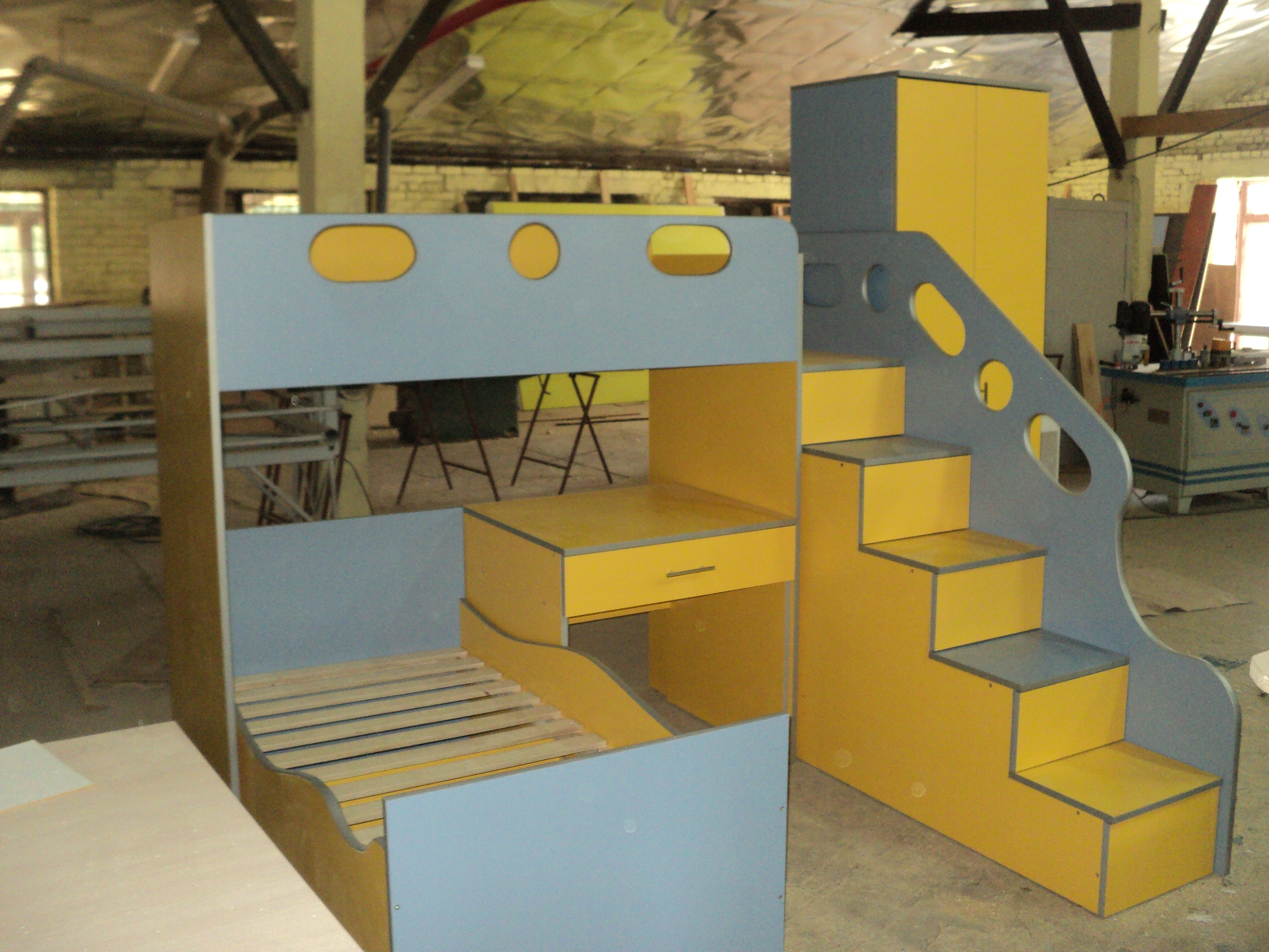 код 87377Все необходимое в одном корпусе: 2 кровати, втч и чердак, лесенка-стеллаж, стол и шкаф.