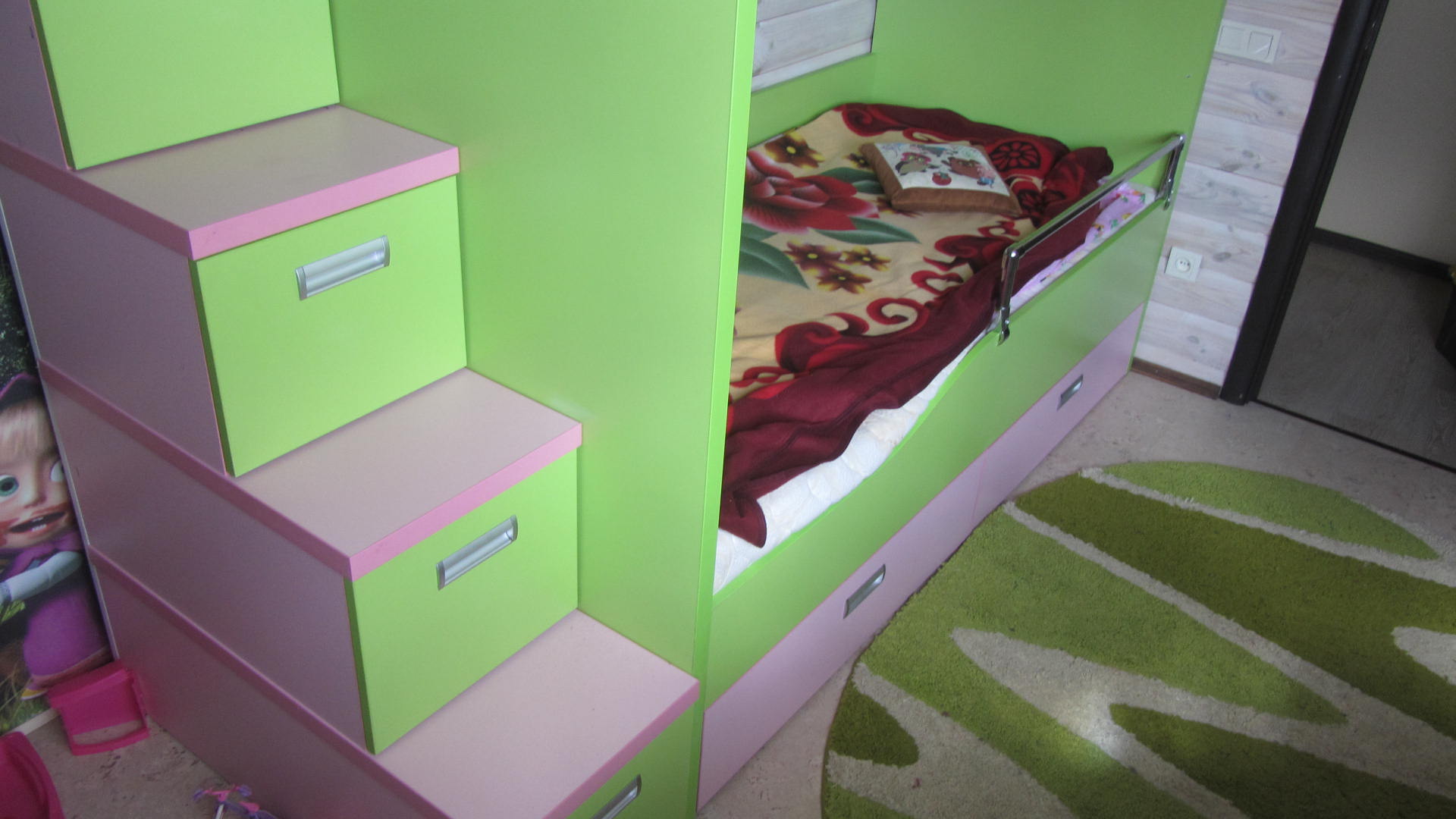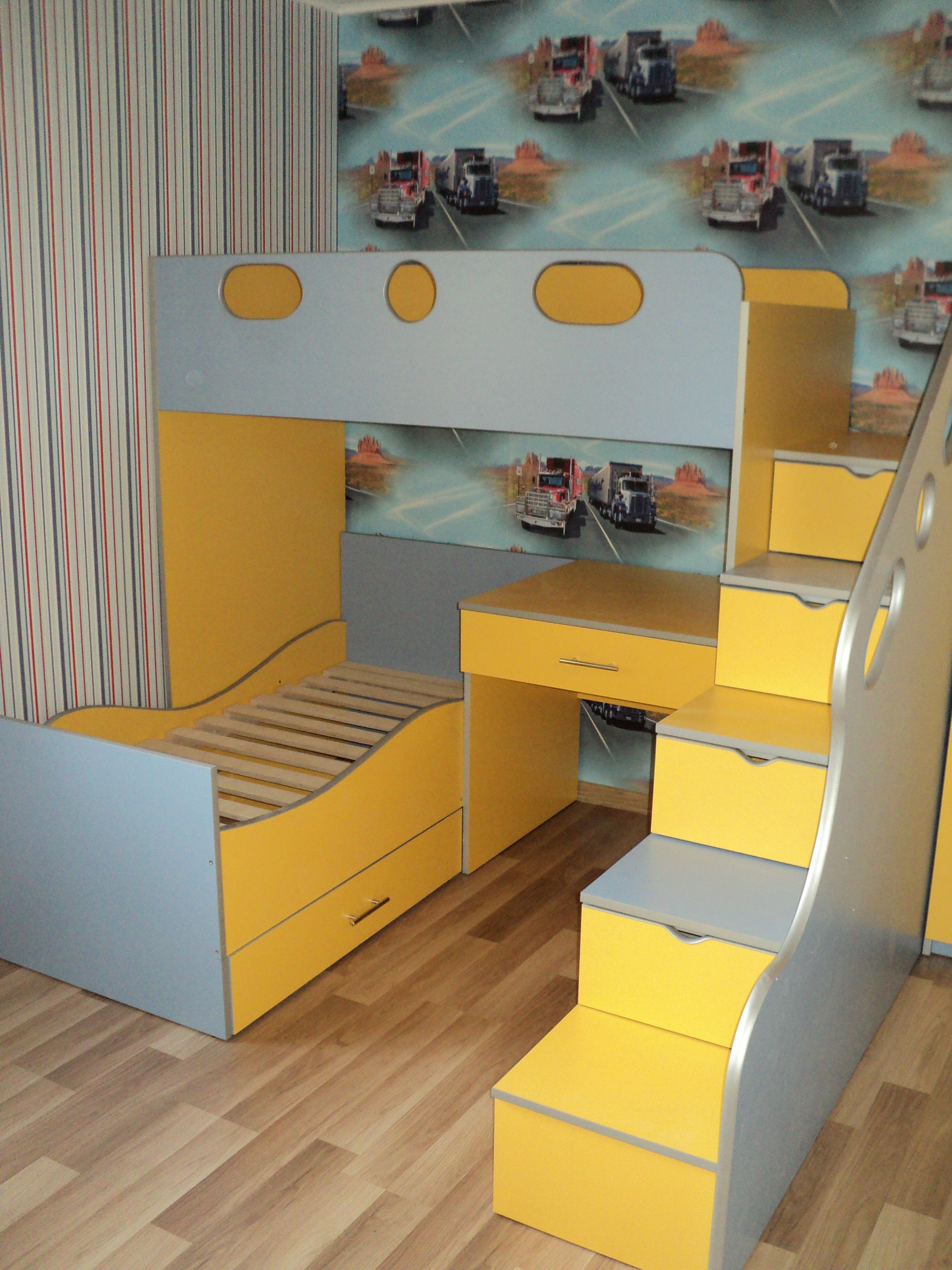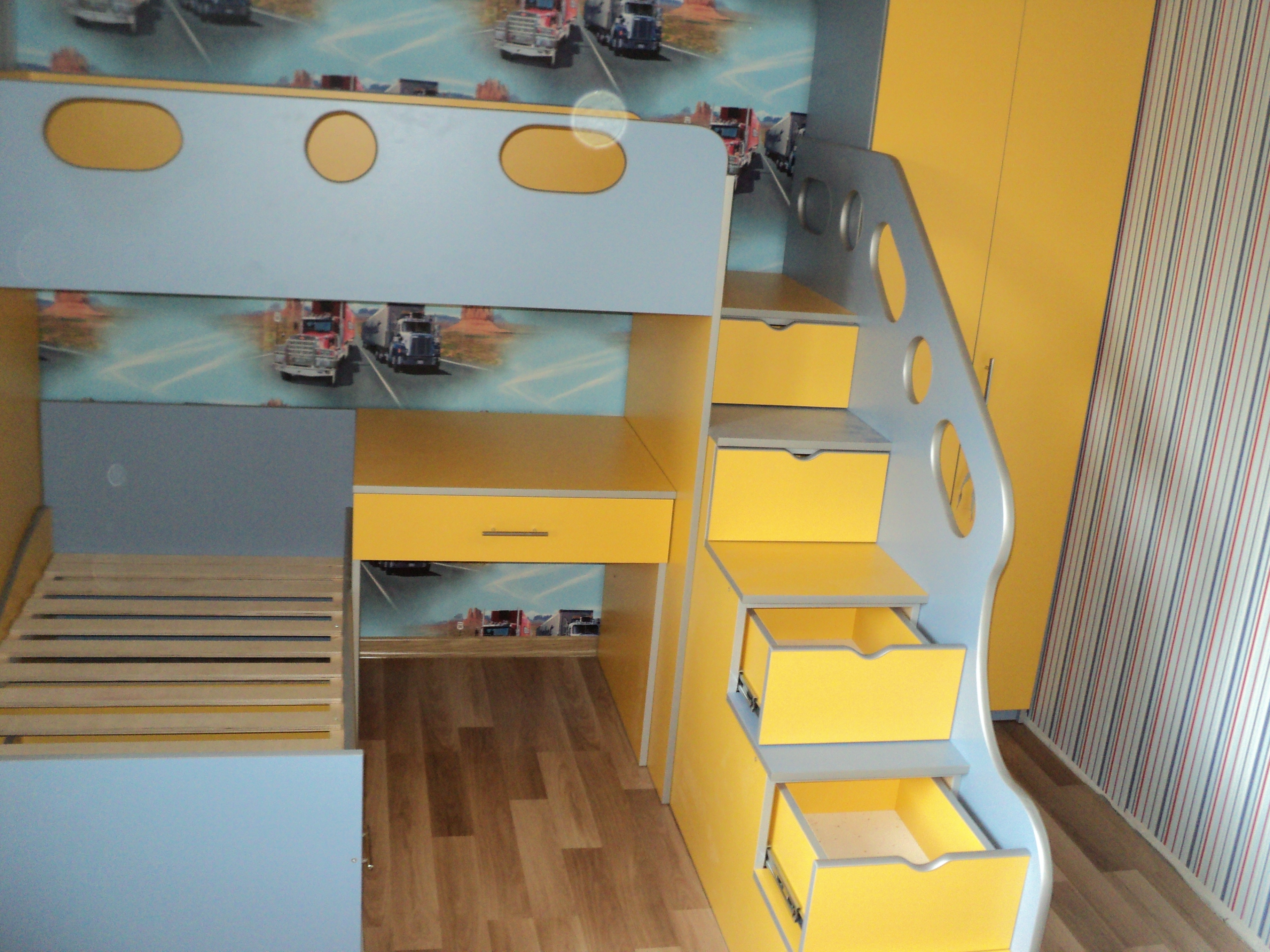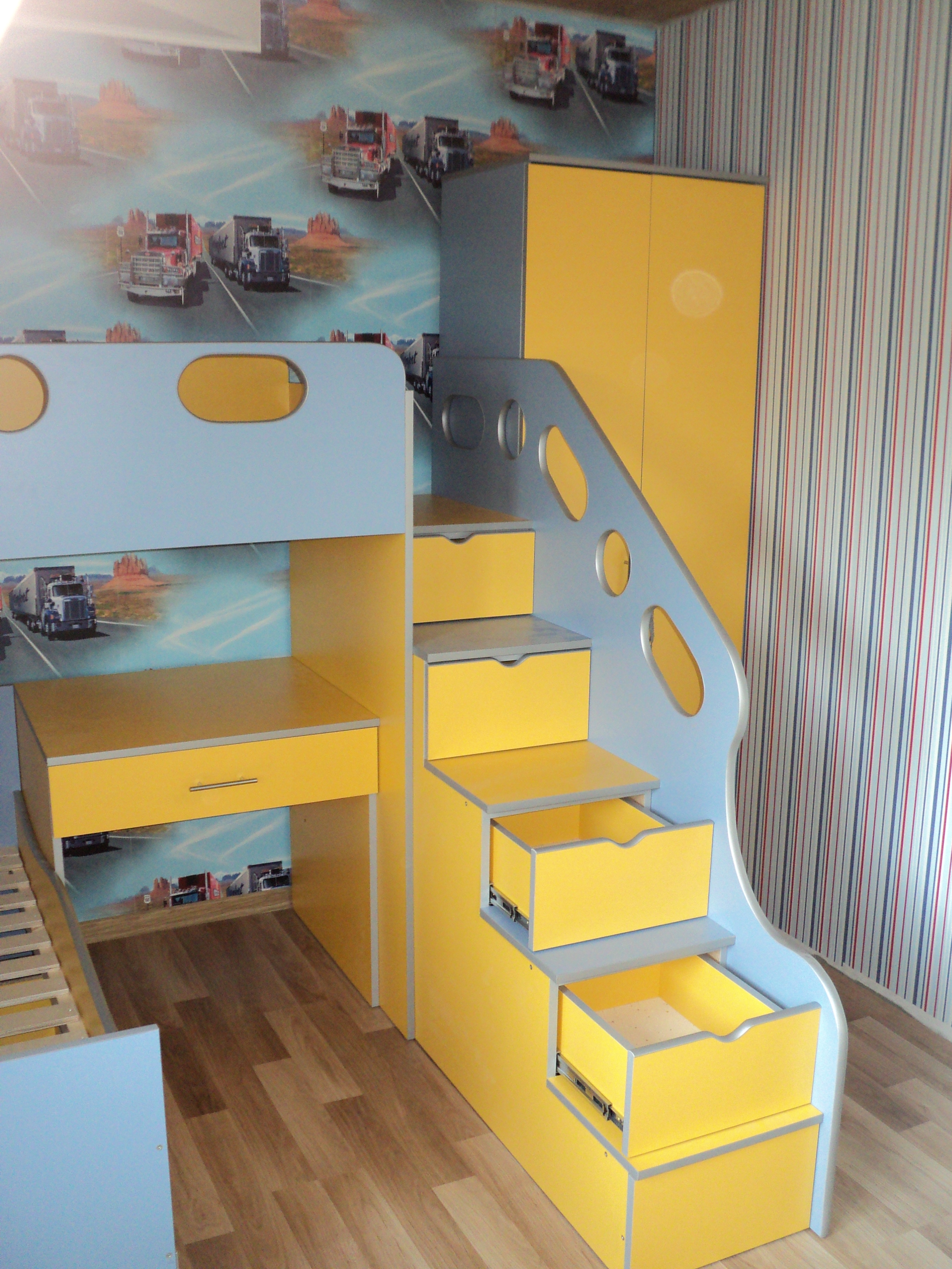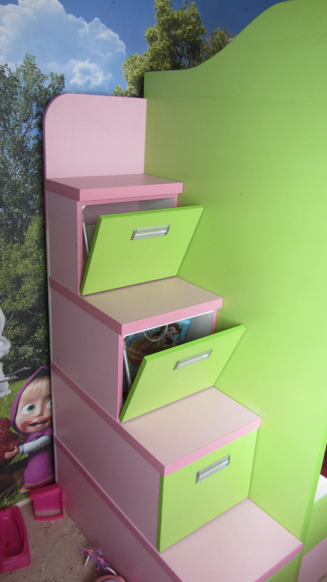 Яркий набор для детской комнаты представляет собой универсальный комплект, в который включено практически все, что нужно ребенку для развития и отдыха. В состав комплекта входят две просторные кровати с защитными бортиками, которые предотвращают выпадение ребенка. Небольшая полочка с шуфлядой, если к ней приставить стул, превратится в небольшой письменный столик. В наборе имеется лесенка-стеллаж оснащена ящиками, в которых можно хранить игрушки, а также распашной шкаф для хранения одежды.