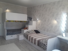 Включает две горизонтальные кровати-трансформеры с мягким изголовьем, рабочий стол и объемную зону для хранения