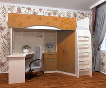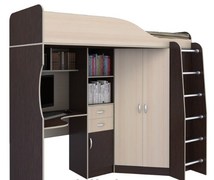 Кровать-чердак с лесенкой, шкаф полками и тумбой и стол с радиусной столешницей.