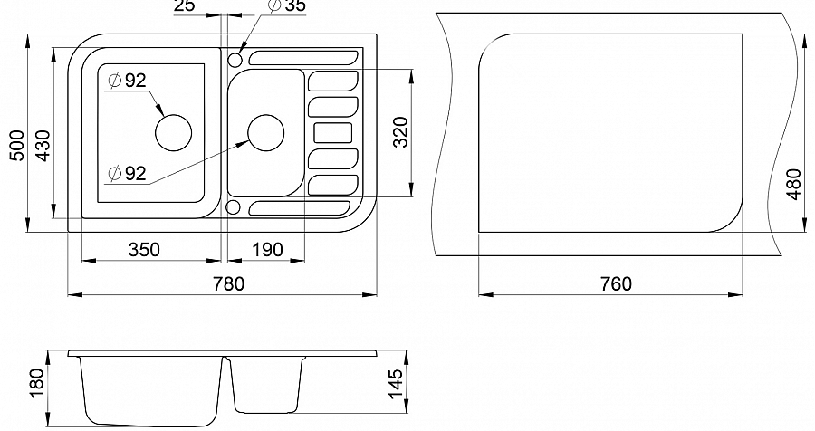 Форма мойки: две чаши, прямоугольная, с крылом, Оборачиваемая (L/R).