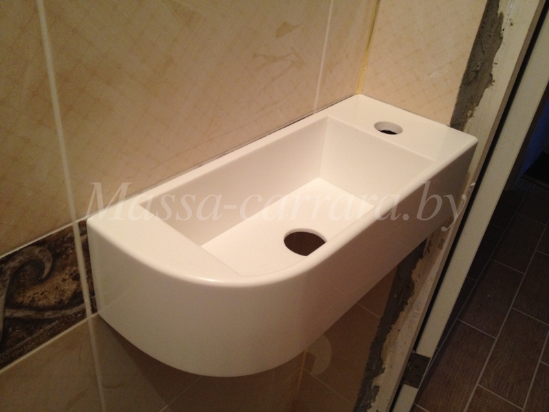 Раковина представляет собой подвесную конструкцию прямоугольной формы. После установки на кронштейны, чаша подключается к системам водоснабжения и водоотведения. Для надежности функционирования подключение и монтаж должен выполнять опытный мастер. Раковина изготовлена из прочного искусственного камня, который отличается высокой долговечностью. На поверхность нанесено защитное покрытие.