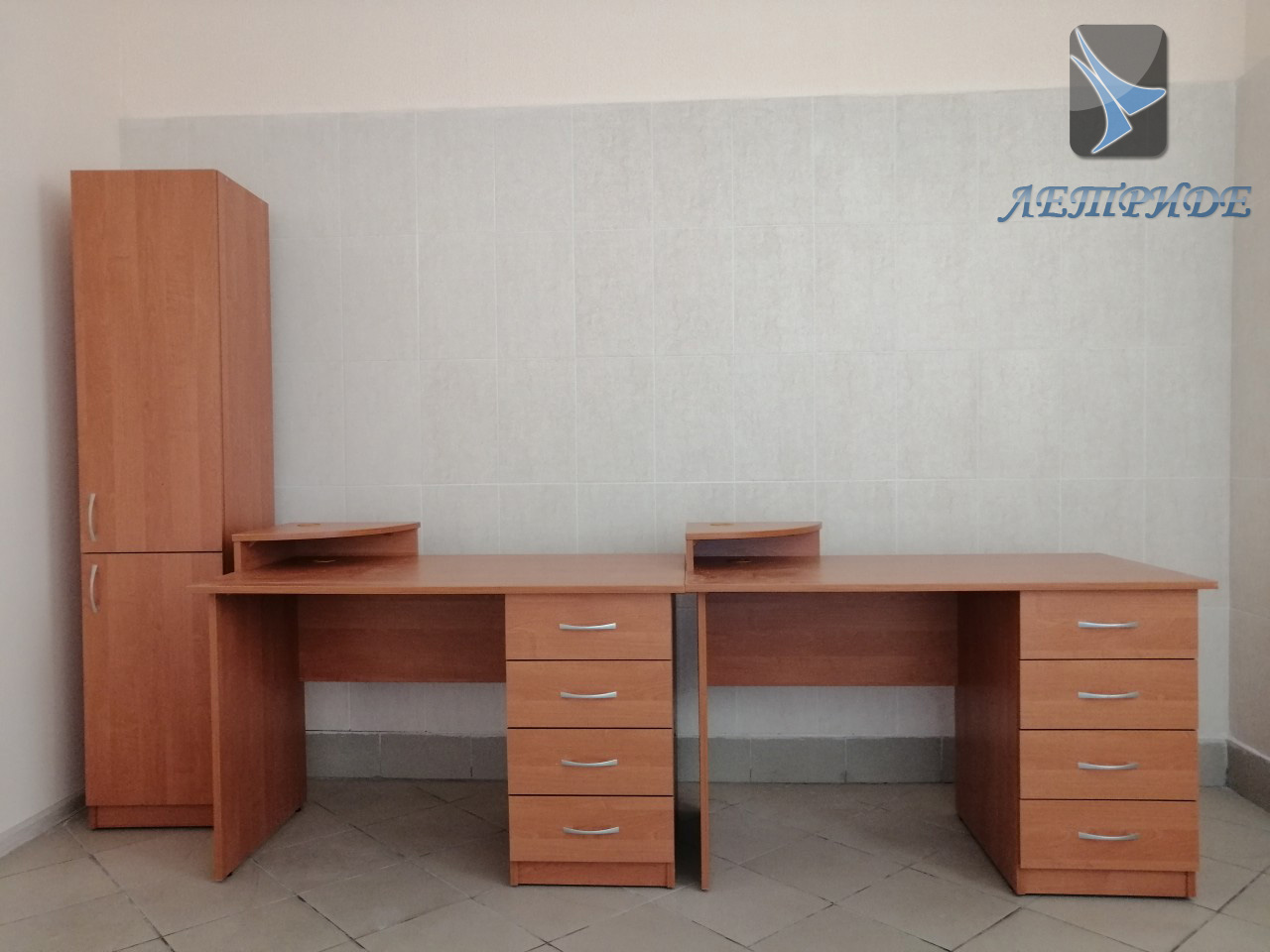 В набор мебели для персонала включены: стол с двумя рабочими местами и распашной узкий шкаф. Фасады окрашены в единый классический коричневый цвет с красно-оранжевым подтоном. Фурнитура металлического окраса гармонично сочетается с фасадами.