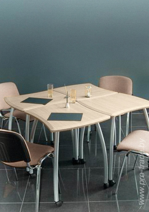 Стол с оригинальной конструкцией. Три офисных стула.