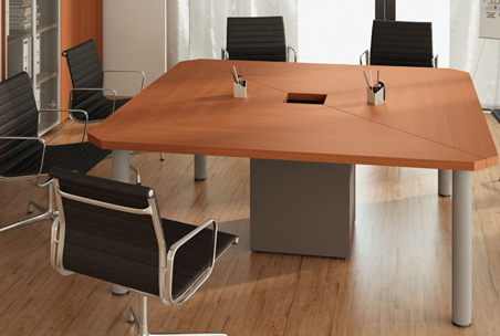 Набор состоит из большого квадратного стола на ножках круглого сечения и восьми стульев с удобными спинками и стильными подлокотниками. Мебельный гарнитур отлично подойдёт для переговорной: за столом можно проводить совещания, встречи с клиентами и партнерами, а также организовывать мозговые штурмы.