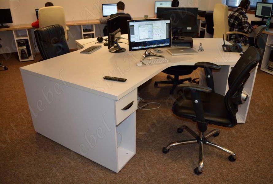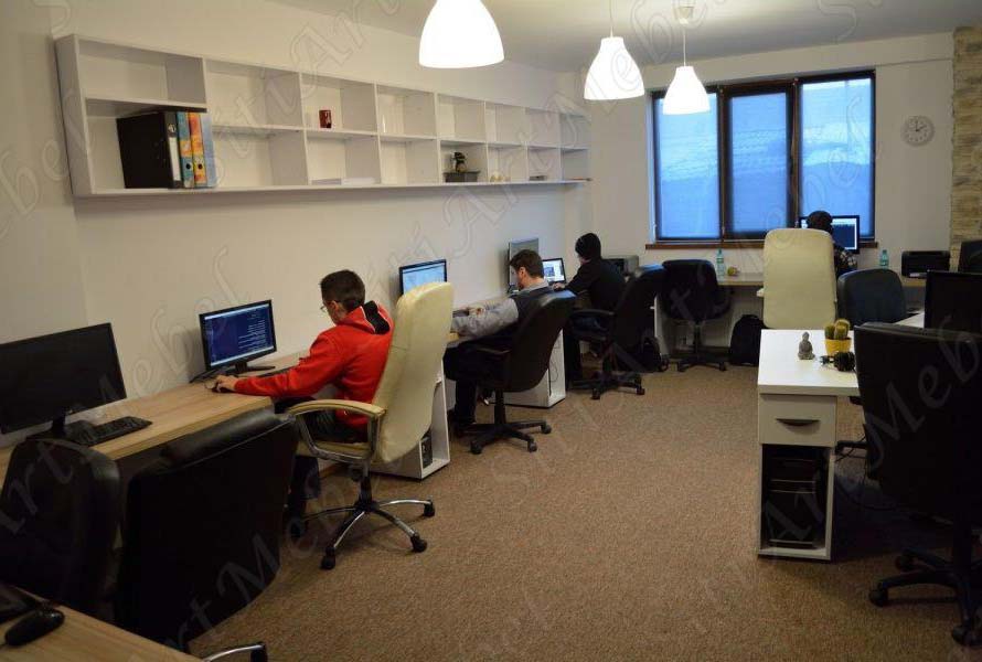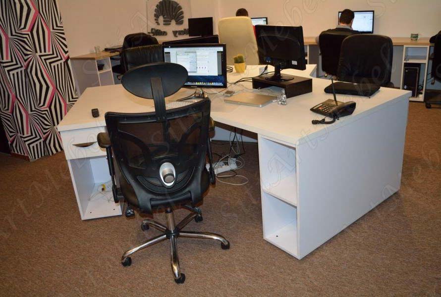 Современный набор мебели поможет создать в вашем офисе уютную обстановку, благоприятную для результативной работы. Каждый из элементов изготовлен из качественных материалов, отвечающих за долговечную эксплуатацию мебели. В комплекте предусмотрен стол для руководителя, подвесная полка и столы для персонала, объединенные общей столешницей.