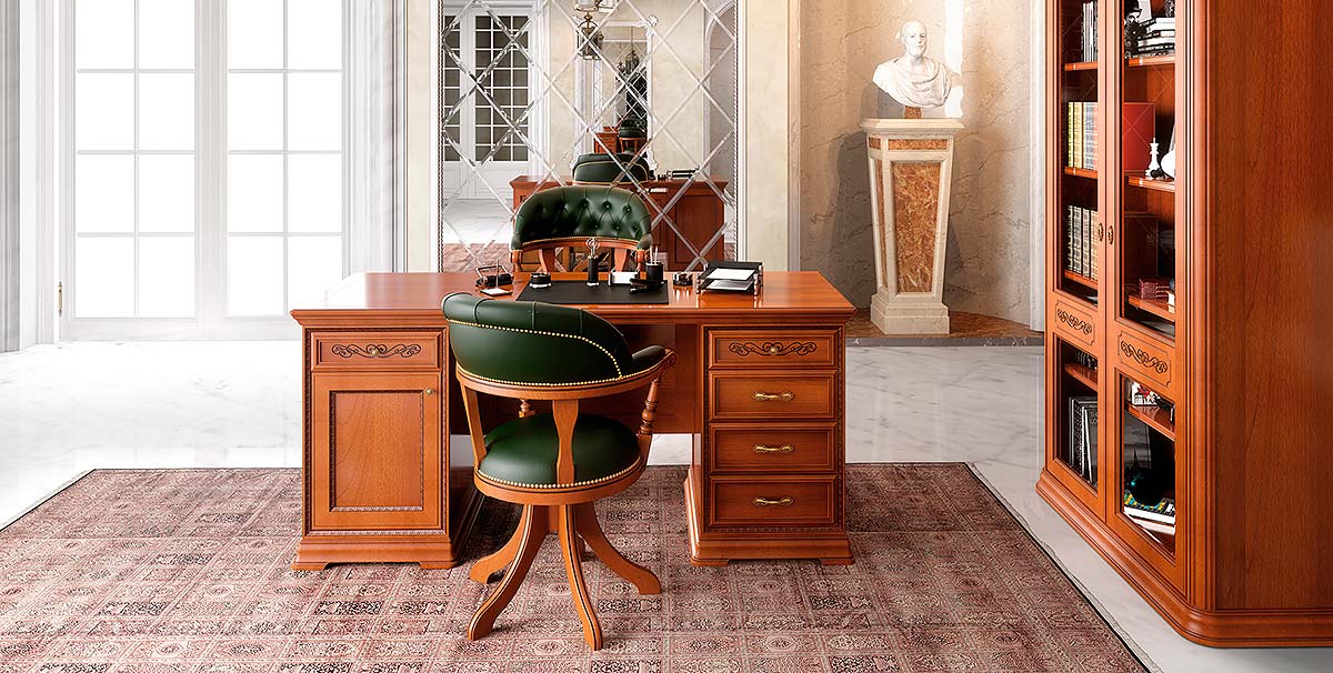 Панели коллекции TORRIANI покрыты шпоном ореха, который отличается устойчивостью к царапинам и ударам, а так же обогащает мебель элегантными муаровыми мотивами. Итальянский классический вкус, с его мягкими и изящными линиями, сделанными инкрустациями клена и резными рамами, достиг преимущества в этой коллекции мебели для домашнего кабинета.