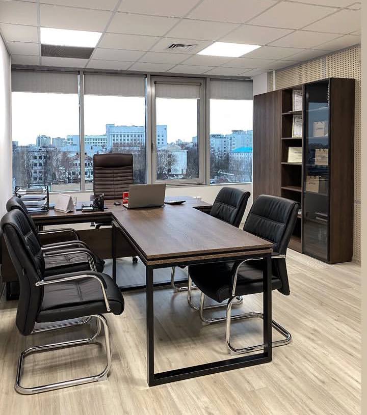 Стильный и сдержанный комплект мебели для кабинета руководителя. Комбинация текстуры тёмного дерева и чёрного металла подчёркивает статус и придаёт интерьеру строгость, при этом оставаясь современным и эргономичным.