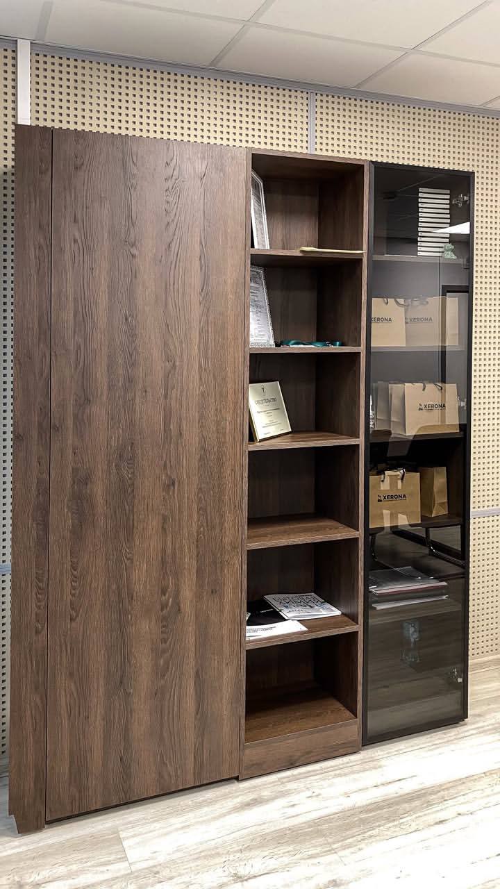 – Стеллаж с комбинированными фасадами: открытые полки и витрина с затемнённым стеклом