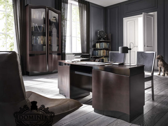 Письменный стол, который вместе с несколькими элементами: двойным высоким сервантом со стеклом, комодом и низким столиком с пуфами подходит для меблировки кабинета или офиса.