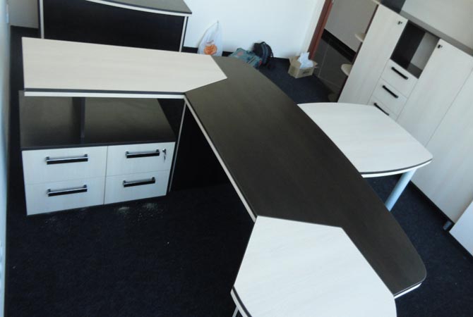 Набор офисной мебели для руководителя состоит из углового стола, невысокого шкафа и тумбочки. Стол оборудован четырьмя выдвижными ящиками и приставной столешницей для посетителей. Шкаф имеет несколько закрытых отделений с распашными дверцами и устанавливается на прочные металлические опоры.