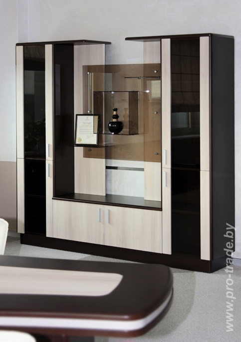 Авторская модификация стеллажа, полки и панели из тонированного стекла позволяют демонстрировать весь арсенал наград и достижений, заслуженных в профессиональной деятельности.