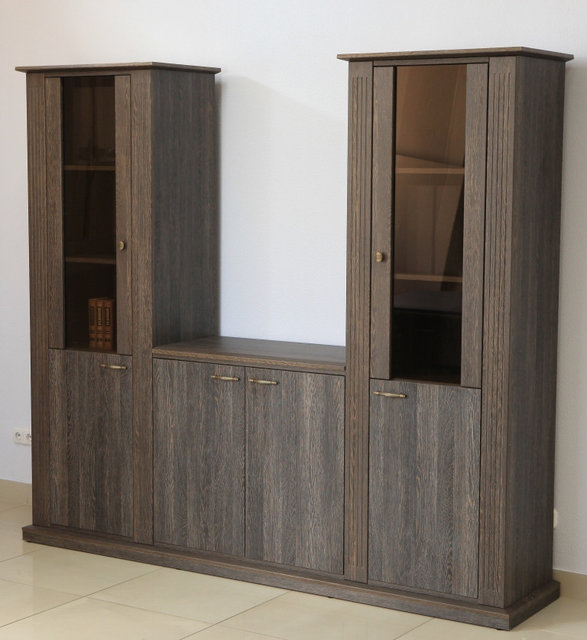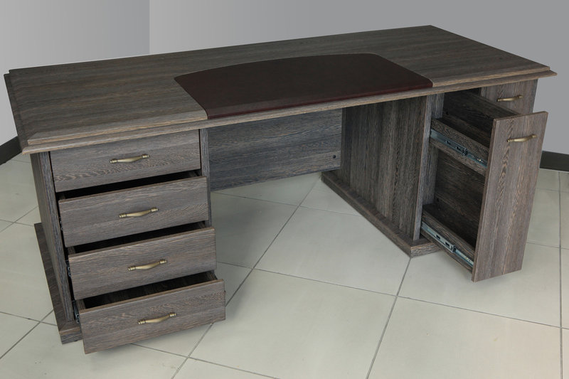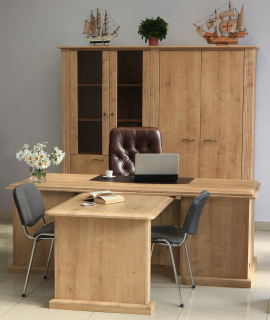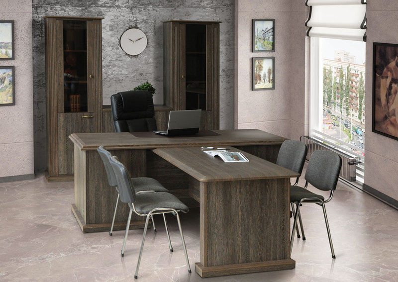 Состав комплекта: стол рабочий, конференц-приставка, переговорный стол, сервисная тумба (тумба помощник), мобильная тумба, шкаф для документов, шкаф-гардероб, тумба под теле-видео аппаратуру, тумба под встраиваемый холодильник (фригобар).