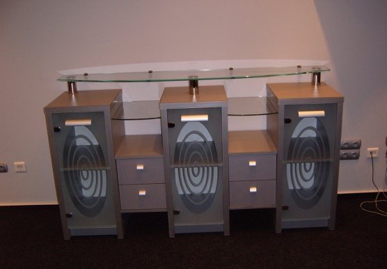 Дополнительно: Корпус и столешница - ДСП ламинированное «Kronopol» (Польша) – цвет "металик". Полки и столешница из стекла 10 мм, на опорах - хром h-100мм, диаметр 50мм.
