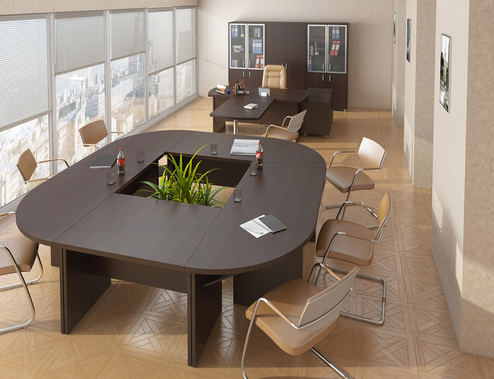 Представленный набор мебели для кабинета руководителя исполнен в цвете венге. Гарнитур включает в себя шкафчики для документов, Т-образный стол с приставной тумбой и несколько столов, образующих большой круглый стол для переговоров.
