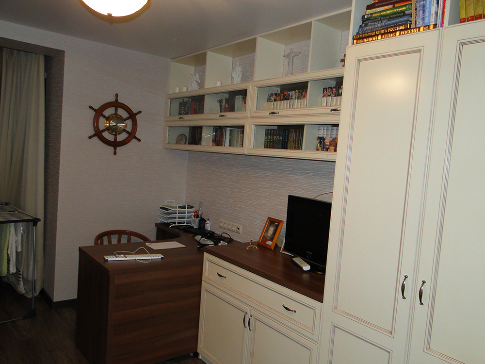 Вместительный шкаф с распашными дверцами. Полки для книг закрыты створками с прозрачным стеклом. В набор входит удобный письменный стол. Фасады гарнитура выполнены из крашеного МДФ с элементами патинирования.