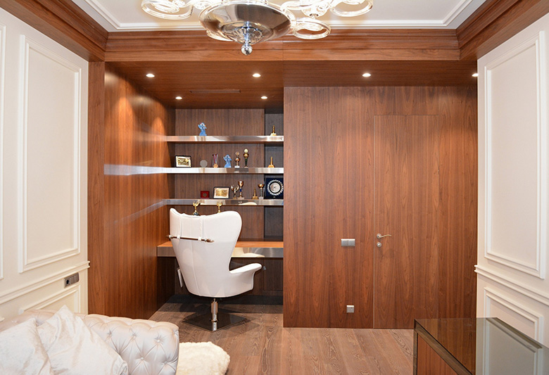 Очень современный стол для кабинета с небольшим пространством помещения встроен в нишу в стене, что позволяет сэкономить место и полностью использовать полезное пространство. Письменный стол, так же как и три открытые полки, не имеет опор, а установлен на крипежи к стене. Цвет выбран коричневый под дерево и с хромированным скосом.