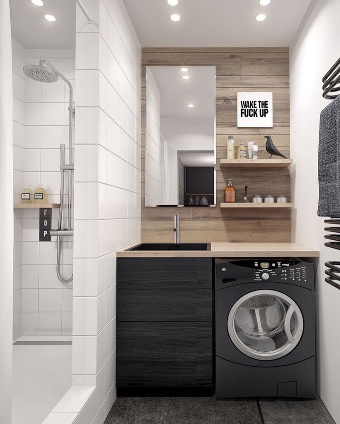 код 109448Включает в себя зеркало, комод, навесные полки, столешницу с нишей для раковины и стиральной машины.