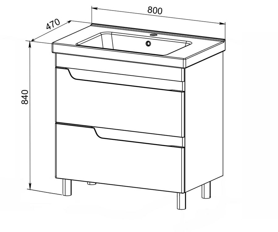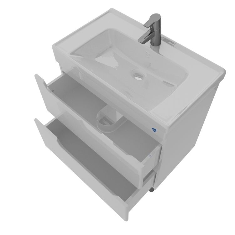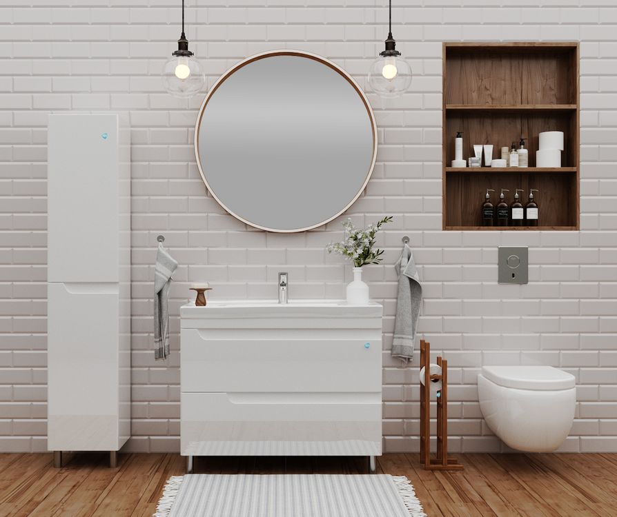 Включает в себя зеркало, комод, навесные полки, столешницу с нишей для раковины и стиральной машины.