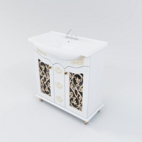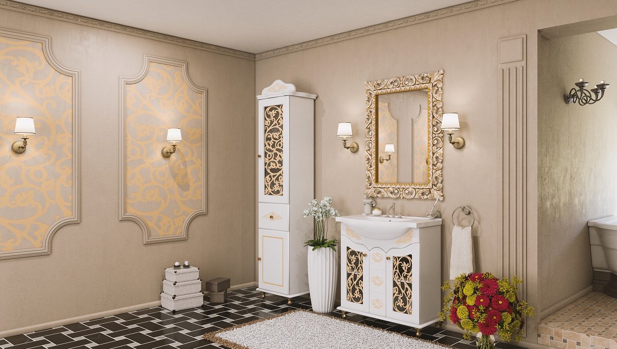 Включает в себя зеркало, комод, навесные полки, столешницу с нишей для раковины и стиральной машины.
