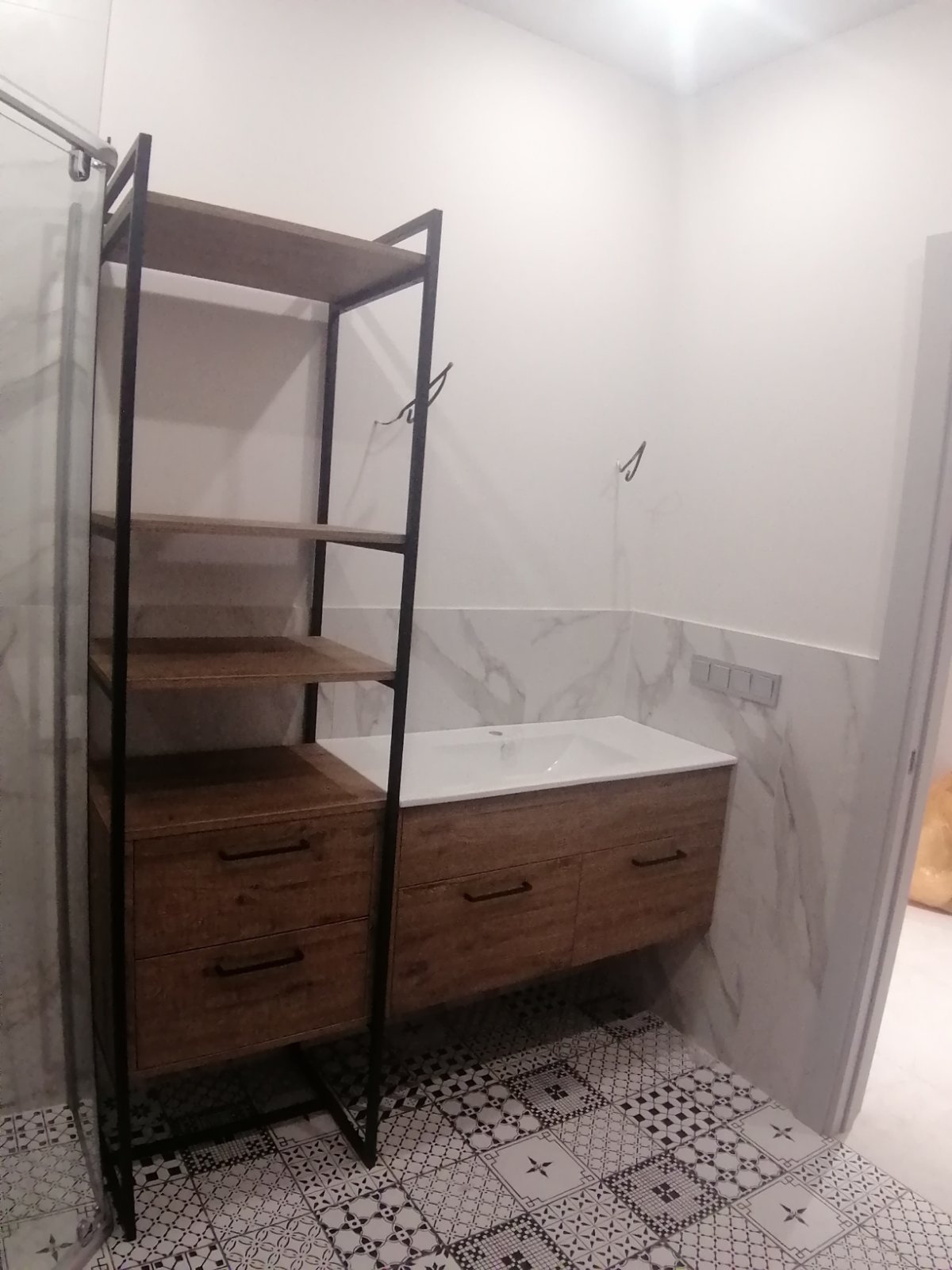 Стеллаж и тумба в ванную комнату. Выдвижные шариковые направляющие с доводчиками полного выдвижения. Металлоконструкция труба 25*25 с полимерным покрытием. Общие размеры в.2000/ш.1500. Цена без учета стоимости умывальника.