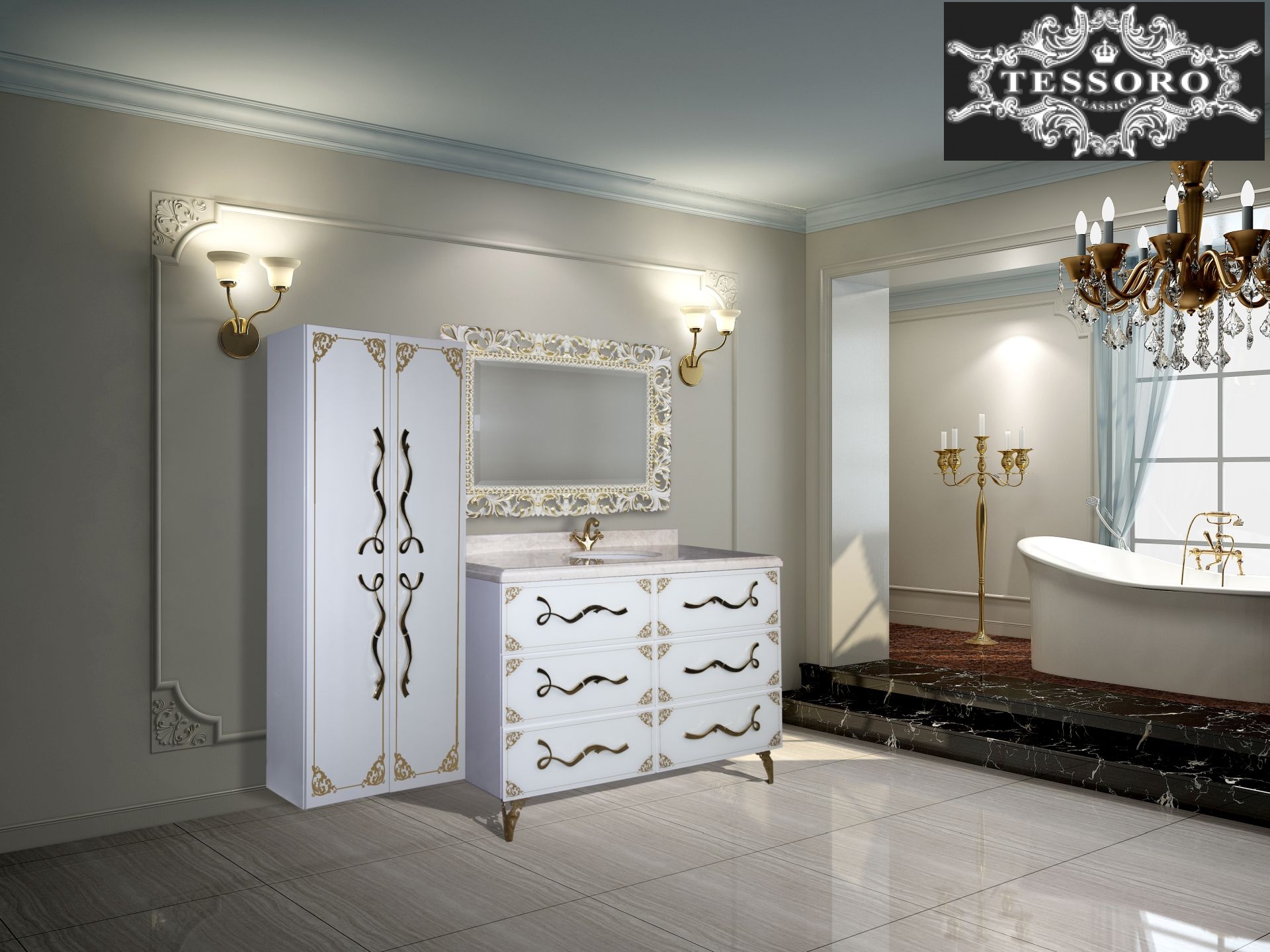 Производится из МДФ, при отделке используется белая глянцевая эмаль или белая глянцевая эмаль декорированная стеклом с нанесенным на него узором золотом или серебром. Ручки возможны в золоте и хроме. Может быть укомплектована столешницей из натурального мрамора под несколько типов раковин.