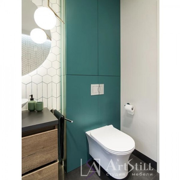 Ванна выполнен в «Современном стиле». Шкаф в ванную закрывает коммуникации и так же служит местом для хранения. Крашеные панели в цвет шкафа зашивают гипсокартонный короб. Ванная на заказ выполнена до потолка. Тумба в ванную навесная.