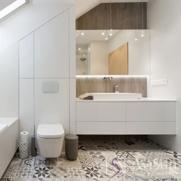 Ванна выполнен в «Современном стиле». Тумба на заказ в ванную навесная. Шкаф в ванную закрывает коммуникации и так же служит местом для хранения. Фасады в шкафу на заказ скошены и повторяют наклон крыши.