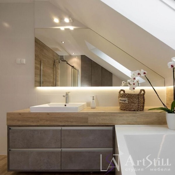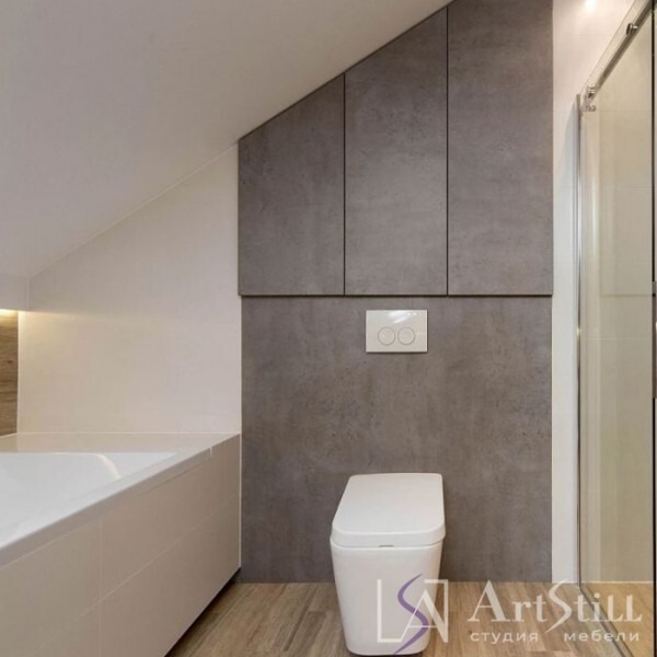 Ванна выполнен в «Современном стиле». Тумба на заказ в ванную навесная. Шкаф в ванную закрывает коммуникации и так же служит местом для хранения.