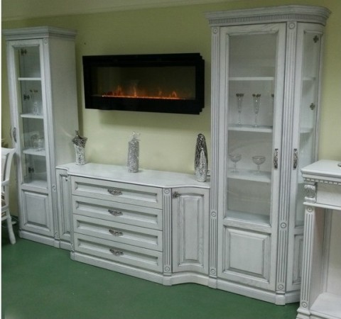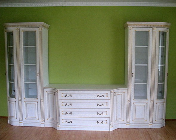 Представленный набор мебели для гостиной выполнен из массива дуба. Набор включает в себя два высоких шкафчика-витрины со стеклянными фасадами и комод с четырьмя выдвижными ящиками и двумя распашными секциями. Набор мебели может быть выполнен в 14-ти вариантах тонировки, что позволяет подобрать нужный цвет для конкретного интерьера.