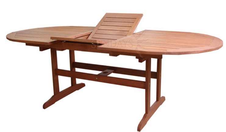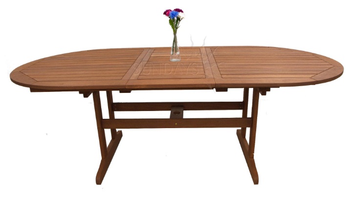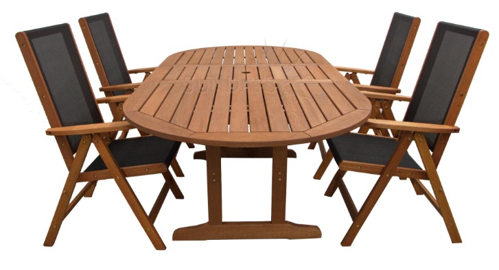 В комплект садовой мебели входит большой стол и четыре стула. Элементы набора выполнены из натуральной древесины и имеют привлекательный дизайн. Поверхность дерева покрыта специальным лаком, который защищает изделия от воздействия дождя и солнца. На спинках и сиденьях стульев имеется мягкая подкладка, повышающая комфорт сидящего на стуле человека. На столешнице присутствуют небольшие прорези.