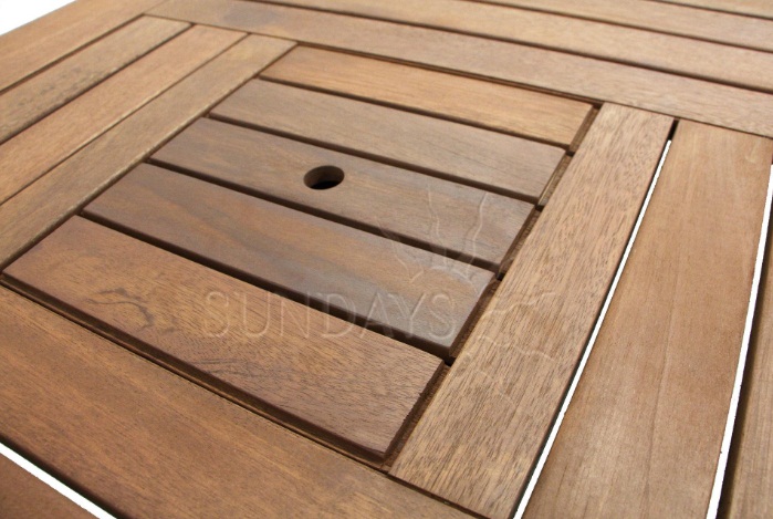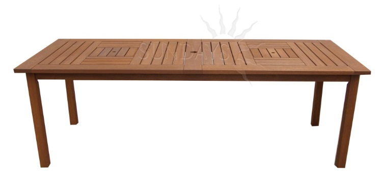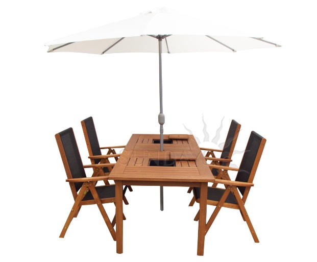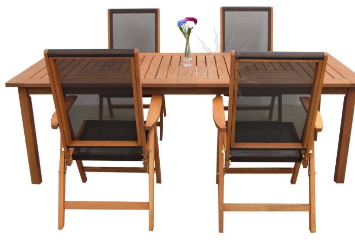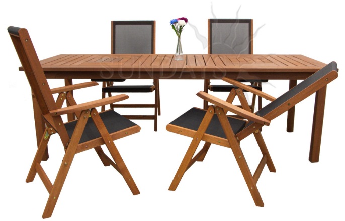 В мебельный набор входит габаритный стол прямоугольной формы и четыре стула. Конструкция стульев позволяет раскладывать их, тем самым повышая комфорт для располагающегося за ним человека. В качестве материала набора используется натуральное дерево, покрытое специальным лаком. Покрытие защищает мебель от внешних природных воздействий и позволяет располать набор на открытой площадке.